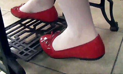 Pretty dark haired woman Petra wears red flats while working with sewing machine