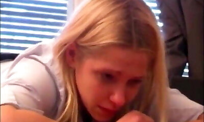 Lovely, blue- eyed blonde schoolgirl is softly blowing her lover's dick, to make him cum