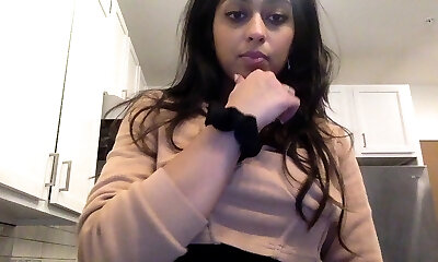 Chubby brunette with huge hooters strokes with fuck stick in the kitchen